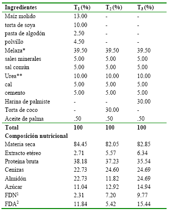 La Amazonía peruana tiene una gran biodiversidad de cultivos, incluyendo la producción de 428000 t de palma aceitera y 9000 t de cocos en la región San Martín1. La harina de palmiste (Palm kernel expeller) (PKE) y la torta de coco (Cocos nucifera) (TC) subproductos de la industria aceitera, obtenida mediante procesos de extracción mecánica o por solventes10. No obstante, la HP juega un papel importante en la nutrición de los rumiantes, es económica y está disponible localmente, también satisface las necesidades nutricionales del ganado, proporcionando proteína, energía, vitaminas y minerales11-13. Mientras tanto, la TC un subproducto alternativo ideal de bajo costo como fuente de proteína para la alimentación de rumiantes14,15. Por su valor nutricional, disponibilidad y bajo precio de mercado, utilizar estos subproductos en la alimentación animal es una buena opción4,14,16. Sin embargo, hasta donde sabemos, es escasa la información sobre los efectos de alimentar ganado vacuno lechero con bloques elaborado con subproductos de la industria local, como PKE y TC. El objetivo de este estudio fue evaluar el efecto de BMN elaborados con subproductos agroindustriales sobre el comportamiento productivo de ganado lechero bajo un sistema extensivo.