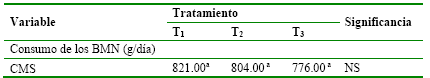 Consumo de materia seca (CMS). El consumo promedio de BMN durante el periodo de evaluación no difirió significativamente (P>0.05) entre T1, T2, T3Tabla 3. Sin embargo, el consumo promedio presento una leve variación para T1, T2, T3 entre 821, 804 y 776 g/animal/día, respectivamente.