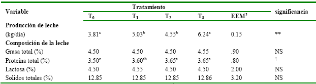 Producción y composición de la leche. Tabla 4 los resultados de producción y composición de leche para los 4 tratamientos experimentales en vacas lactantes. Se observó diferencia significativa (p<0.05) entre el grupo de vacas que no recibieron suplemento de bloque (T0) y las que recibieron (T1, T2, T3) se obtuvieron promedios (3.81) y (5.03, 4.55, 6.24) kg/animal/día, respectivamente. La composición de la leche, los animales suplementados con el BMN presentaron un mayor contenido proteico (%) en comparación con los animales no suplementados. Los valores de lactosa % y sólidos totales % no difirieron entre tratamientos.