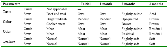 At pH 5.9 from month 2 the samples showed variations in 3 parameters and in month 3 a change in odor (Table 2). At pH 6 to 7 from month 2, there were variations in color and odor, and in month 3 in texture and odor. At pH 5.9 and pH 6 to 7 after 2 months of storage, there were evident signs of deterioration (Table 2).