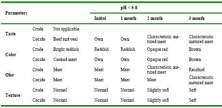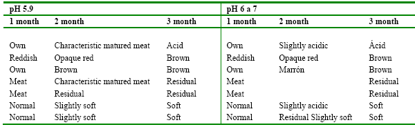Sensory analysis. The organoleptic characteristics of flavor, color, odor and texture were evaluated in cooked meat from the beginning to the end of the test (Table 2). At pH < 5.8 there were no variations in the first month, but in the second month a change in color was observed (it became an opaque red) and in the third month there were variations in the three parameters.