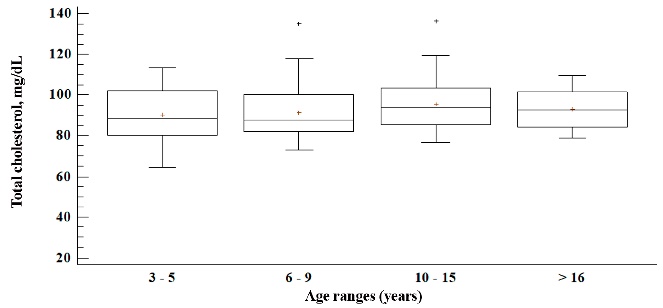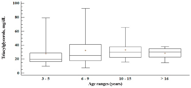 En la Figura 4, se observa los niveles séricos de TG, estos valores se incrementaron hasta los 10 a 15 años de edad (33.3 mg dL-1) y disminuyeron en el último rango etario (28.4 mg dL-1), no hubo diferencias significativas (P > 0.05). El valor mínimo y máximo se observó en el grupo de 6 a 9 años de edad (7.4 y 92.4 mg dL-1 respectivamente).