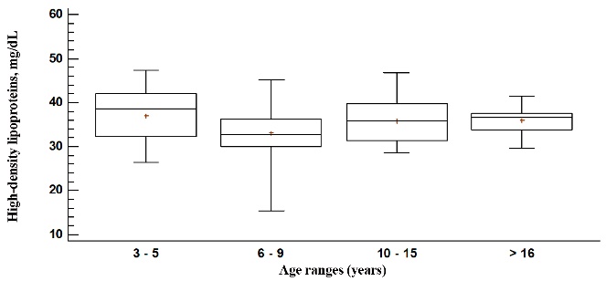 En la Figura 2, se observan los niveles séricos de las HDL-CT, el mayor nivel sérico estuvo en los de 3 a 5 años de edad (37.3 mg dL-1), los rangos etarios desde 10 años (35.8 mg dL-1) y mayores a los 16 años fueron similares (35.9 mg dL-1) y el menor nivel sérico fue en 6 a 9 años (33.0 mg dL-1), los valores tuvieron diferencias significativas (P < 0.05). El valor mínimo se observó en el rango etario de 6 a 9 años (15.5 mg dL-1) y el valor máximo ocurrió en los de 3 a 5 años de edad (47.3 mg dL-1).