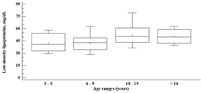 En la Figura 3, se observa los niveles séricos de LDL-CT, el mayor nivel sérico se observó en el rango etario de 10 a 15 años (52.2 mg dL-1), fue similar con relacion a la edad, mayor a 16 años (50.6 mg dL-1), los rangos etarios desde 3 hasta los 9 años tuvieron los menores valores y fueron similares entre sí (42.2 y 42.5 mg dL-1 respectivamente), los valores presentaron diferencias significativas (P < 0.05). El valor mínimo se observó en el rango etario de 6 a 9 años (28.4 mg dL-1) y el valor máximo de 10 a 15 años de edad (79.4 mg dL-1).
