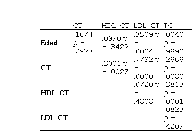 En la Tabla 1, se observa la relación entre los niveles séricos del PL y la edad de los CCC, existe una correlación lineal positiva entre las variables. Además, se observa que existe una correlación muy baja (r = 0.2 a r = 0.3) entre la edad y los niveles séricos de LDL-CT significativa (P < 0.05), también, entre los niveles séricos del CT y de la HDL-CT y TG existe una correlación muy baja (r = 0.2 a r = 0.3) que fueron significativas (P < 0.05) y ocurre lo contrario entre el CT y LDL-CT, existe una correlación alta (r = 0.6 a r = 0.7) que fueron significativas (P < 0.05); además, entre los niveles séricos de la HDL-CT y TG existe una correlación muy baja (r = 0.2 a r = 0.3) que fue significativa (P < 0.05).