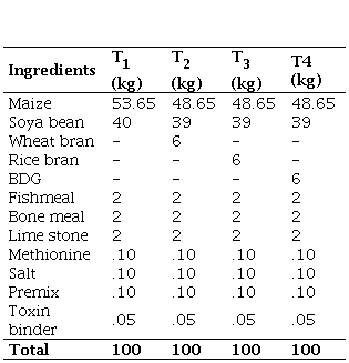 Experimental diet. The experimental diet was formulated for both starter and finisher phase. The major source of energy for the diet was maize and the major source of crude protein was soya bean meal. The control diet T1 was formulated without dietary fibre, T2 was formulated with wheat bran as the source of fibre, T3 was formulated with rice bran as the source of fibre and T4 was formulated with brewers dried grain (BDG) as the source of fibre.