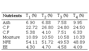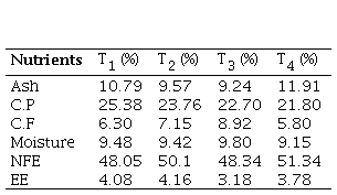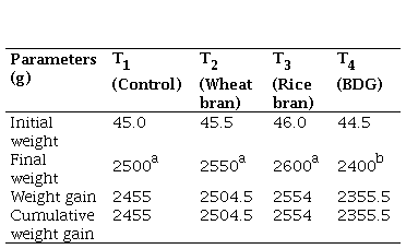 T1 diet without any source of fibre, T2 diet with wheat bran as source of fibre, T3 diet with rice bran as source of fibre, T4 diet with BDG as source of fibre, C.P crude protein, C.F crude fibre, NFE nitrogen free extract, EE ether extract.
