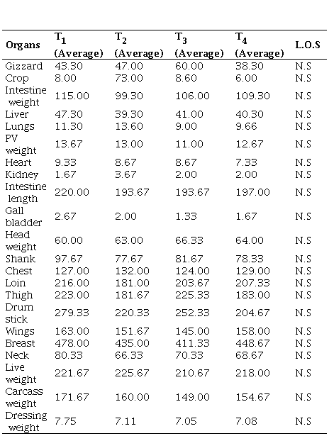 Carcass characteristics and internal organ weights. Carcass characteristics are crucial for assessing the quality of meat produced in broilers. Table 2 reveals that there were no significant differences in the carcass yield, breast muscle, or thigh muscle weights between the rice bran and control groups. However, a noticeable increase in gizzard weight was observed in the rice bran-fed birds (T3), suggesting that rice bran’s high fiber content promotes greater gizzard development. This observation aligns with the findings of, who suggested that higher fiber intake can stimulate gizzard growth, as the organ plays a critical role in breaking down fibrous material, thereby aiding digestion19-21.