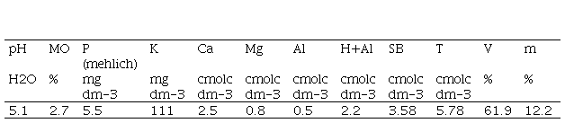The soil at the research implantation site is classified as Oxisol (Santos et al., 2006) with clayey texture, and soil sampling is carried out at the research implantation site for chemical analysis of fertility according to methodology proposed by Teixeira et al. (2017), and the results of analyses are presented in Table 1.
