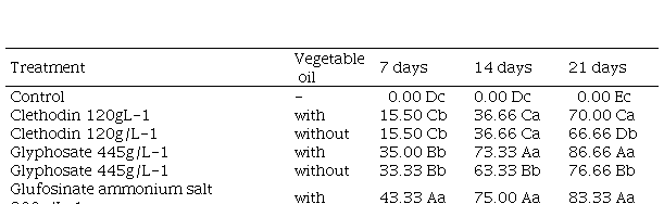 At 14 DAA, herbicides that showed the best results were glufosinate ammonium salt 200g/L-1 and glyphosate 445g/L-1, being also enhanced by the use of vegetable oil. All herbicides had statistical differences compared to control treatment.