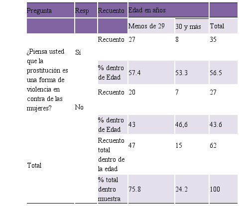 La tabla desvela que, la edad en sí no impacta mucho en la percepción de las mujeres estudiadas sobre la prostitución, ya que, sin importar la edad, el 56.5% de toda la muestra considera a la prostitución como forma de violencia. Pero no deja de llamarnos la atención ese significativo 43.6% restante que, a pesar de las condiciones donde de desempeñan, no perciben la prostitución como una forma de violencia