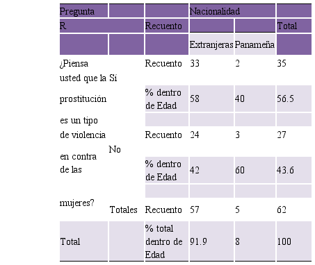 El grupo de las extranjeras incluye a las de origen colombiano (59%), muy distante, pero en segundo lugar a las de origen dominicano (27%), panameñas el 8.1% y otras en menor porcentaje, a las nicaragüenses y peruanas. El cuadro se elaboró en dos grupos, las extranjeras en mayor porcentaje ven la prostitución como forma de violencia. Esto se entiende porque un número importante de ellas son víctimas de la trata de blancas, se encuentran solas en país extraño y obligadas a continuar la actividad por su estatus de ilegal.