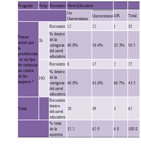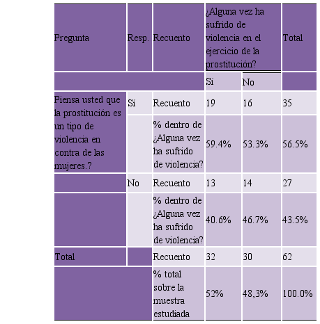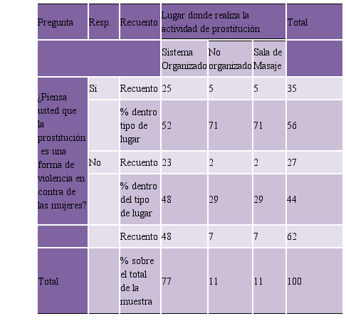 Sin importar el lugar donde ejerce la prostitución, todos los porcentajes relativos de las encuestadas son mayores en concebir la actividad como forma de violencia, siendo el grupo que la ejerce en la calle quien tiene el porcentaje relativo más alto en aceptarla como tal. Se entiende que la calle es un área sin testigos, sin árbitros, sin los chulos ni proxenetas que se relacionen con la trabajadora sexual. Se encuentra sola y allí es más vulnerable a sufrir de alguna forma de violencia