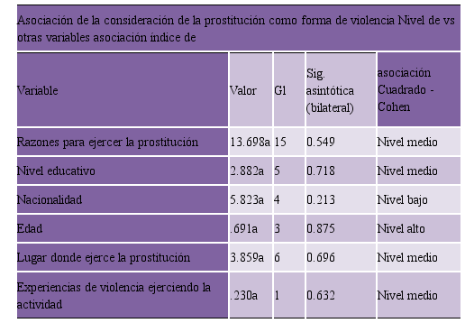 Todas las variables estudiadas, resultaron asociadas con la percepción que tiene la trabajadora sexual sobre la prostitución como forma de violencia, pero en niveles diferentes. En un nivel alto con su edad, en un nivel medio con razones para ejercer la prostitución, nivel educativo, lugar donde ejerce la prostitución y experiencias de violencias; en tanto que la nacionalidad resultó con un nivel bajo de asociación.
