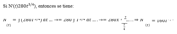 Ejercicio N°2: Una fábrica contamina un lago de manera que la razón de elementos contaminantes que ingresan en el lago en el tiempo t, en meses, está dada por N'(t)280𝑡3/4) donde N es el número total de libras de contaminación en el lago en el tiempo t. ¿Cuantas libras de contaminantes ingresan en el lago en 16 meses?