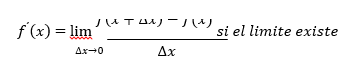 Derivada de una función: Sea f una función definida en todo número real de algún intervalo I, la derivada de f es aquella función, denotada por f ', tal que su valor en cualquier número x de I, está dado por: