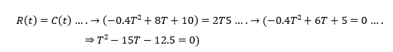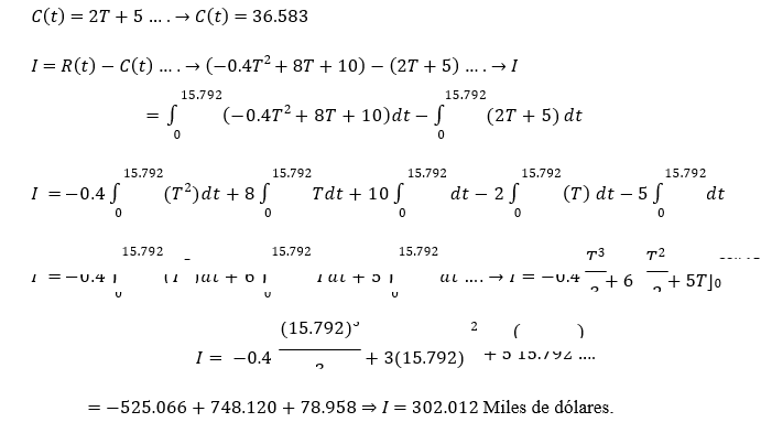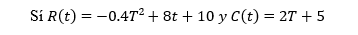 nuevo fertilizante produce una razón de incremento en ingresos (en cientos de dólares) dada por𝑅(𝑡) = −0.4𝑡2+8t+10, donde t se mide en años. La razón del incremento en costo anual (también en cientos de dólares) debido al uso del fertilizante está dado por 𝐶(𝑡) = 2𝑡 + 5.