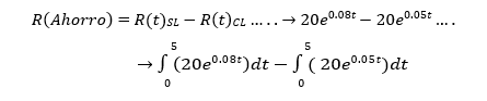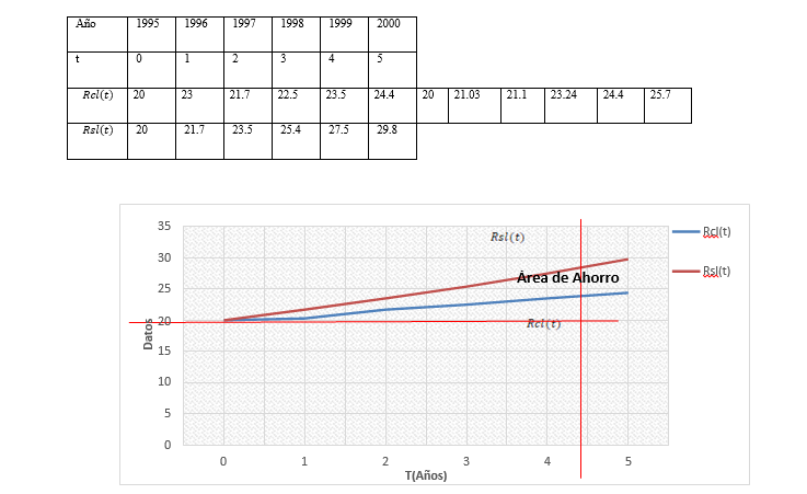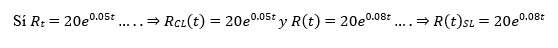 Ejercicio N°4: En un estudio de 1994 para el comité de Desarrollo Económico de un país en desarrollo, los economistas del gobierno y los expertos en energía concluyeron que, si se implementa la Ley de la conservación de la energía en 1995, el consumo nacional de petróleo del país durante los siguientes cinco años aumentaría de acuerdo con el modelo 𝑅𝑡 = 20𝑒0.05𝑡donde t se mide en años (t=0 corresponde al año 1995) y 𝑅𝑡 en millones de barriles por año; sin embargo. Si el gobierno no imponía medidas de conservación de la energía, la tasa esperada de