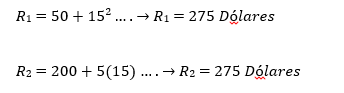 Plan de inversión 1) 𝑅1 = 50 + 𝑥2 Dólares Plan de inversión 2) 𝑅2 = 200 + 5𝑥 Dólares