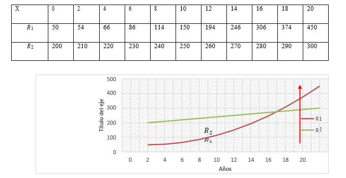 𝑅2(𝑥) = 200 + 5𝑥 𝑑ó𝑙𝑎𝑟𝑒𝑠 𝑝𝑜𝑟 𝑎ñ𝑜.
