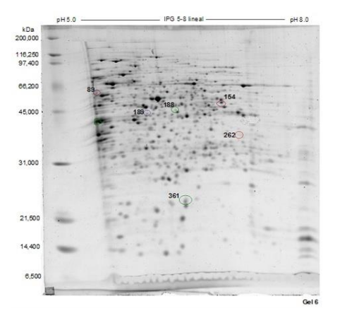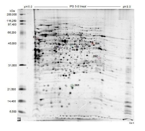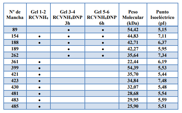 En la Tabla 1 se presentan las manchas (proteínas), que se inducen, reprimen o sobreexpresan en las distintas condiciones experimentales, así como su punto isoeléctrico y peso molecular en kDa.