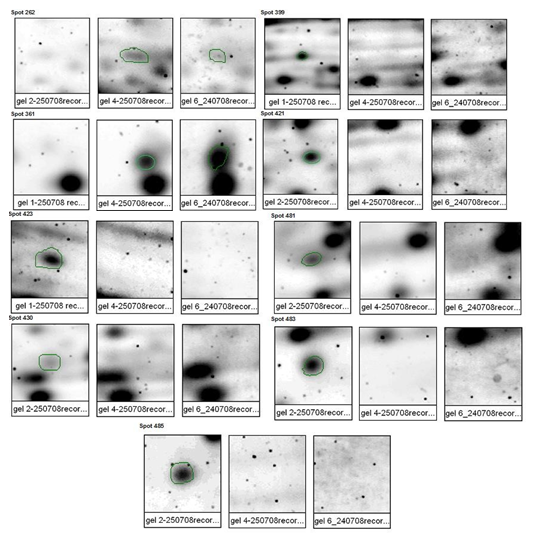 Finalmente para las células cultivadas en amonio (control) y en amonio más DNP, se identificaron en total trece manchas (proteínas) de expresión diferencial (inducción, represión y sobreexpresión) basándose en el programa informático ImageMaster 2D v3.1 de Amersham- Pharmacia, a partir de los geles de 17 cm, con sus correspondientes pesos moleculares y puntos isoeléctricos, en donde se espera observar en el proteoma el efecto del amonio sobre el consumo de 2,4-DNP y sobre la regulación de procesos de transporte de 2,4-DNP al interior celular; expresión del (los) gen (es) de la (s) nitroreductasa (s), actividad nitroreductasa y los donadores de electrones a la (s) nitroreductasa (s).