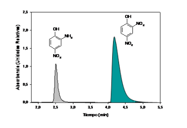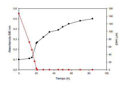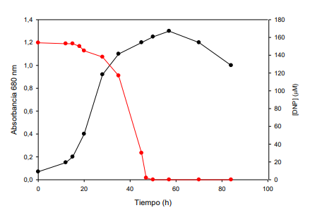 La bacteria Rhodobacter capsulatus B10S se cultivó en anaerobiosis en medios RCV con malato 30 mM como fuente de carbono, utilizando glutamato sódico(1 g/L), cloruro amónico (10 mM) o el dinitrógeno molecular disuelto en el medio (16 mg/L) como fuente de nitrógeno y en presencia de 2,4-dinitrofenol (DNP) 200 µM. Como puede verse en la figura 1, la bacteria transformó rápidamente todo el 2,4-DNP en Aminonitrofenol (ANP). Mientras que en condiciones diazotróficas (condiciones de fijación de nitrógeno) como se observa en la figura 2, la degradación del 2,4-DNP fue más lenta.