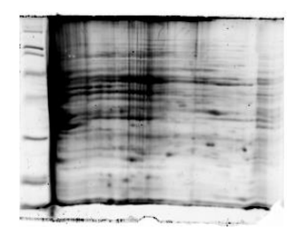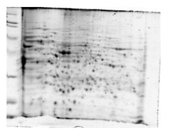 Al llevarse a cabo los geles de 7 cm la resolución de las proteínas no fue la esperada, sugiriéndose la presencia de impurezas (sales o pigmentos propios de la bacteria) en los extractos proteicos obtenidos figura 5. Para mejorar estos resultados se le añadió a los extractos proteicos 4 volúmenes de metanol, luego 1 volumen de cloroformo, seguidamente se le añadió 3 volúmenes de agua miliQ (luego de cada paso se agitó la muestra), en este punto la muestra debe tener aspecto lechoso. Se centrifugó a 12000 g durante 5 min y se eliminó la fase superior (las proteínas se quedan en la interfase formando un anillo blanco), luego se añadieron 3 volúmenes de metanol y se agitó, se centrifugó a 12000 g durante 5 min y se eliminó el sobrenadante, finalmente se dejó secar por 10-15 min y se resuspendió en el tampón de solubilización. Se llevó a cabo nuevamente la electroforesis bidimensional en los geles de 7 cm obteniéndose una mejor resolución y enfoque de las manchas (proteínas) como se aprecia en la figura 6.