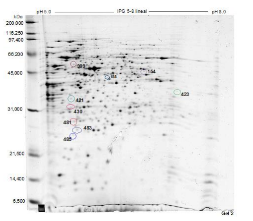 Aislamiento de proteínas y análisis mediante espectrometría de masas: las proteínas (manchas) de interés se enviaron al SCAI-Universidad de Córdoba para ser recortados, digeridos con tripsina e identificados mediante huella peptídica (MALDI-TOF/TOF).