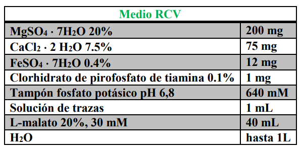 Los medios de cultivo utilizados se esterilizaron en autoclave durante 20 min a 126 ºC, se suplementaron con el antibiótico sulfato de estreptomicina con una concentración en el medio de 200 mg/mL. Como medio mínimo para el cultivo rutinario de la estirpe de R. capsulatus B10S se empleó RCV (cuadro 1) (Pérez-Reinado, 2005).