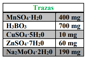 La solución de trazas (cuadro 2) se preparó disolviendo en 250 mL de agua los siguientes componentes: