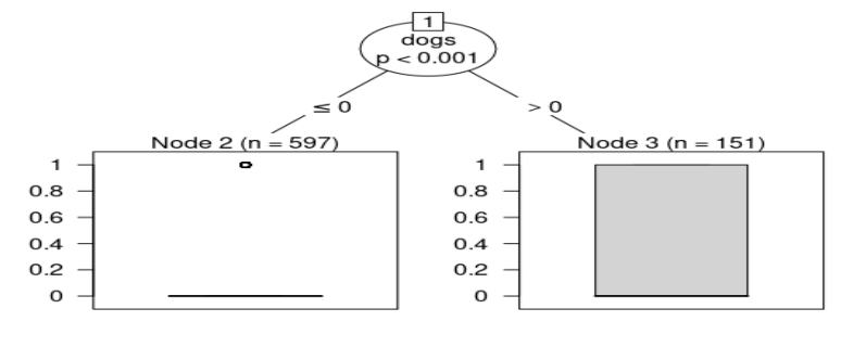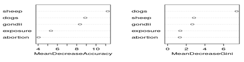 Los resultados de la elaboración del modelo, hecho en función de la seroprevalencia, demostraron que la presencia de perros infectados es un factor de riesgo para la ocurrencia de infección por N. caninum. El nivel de desigualdad entre los grupos fue definido por la presencia de cánidos, principalmente, seguido por la de ovinos y del T. gondii. En términos de factores de riesgo, la precisión de los resultados se da principalmente en ovinos. La presencia de abortos fue el factor que contó con la menor precisión entre los atributos evaluados (precisión ≈80%, min=73%, max = 84%, sensibilidad = 100% [Tablas 2 y 3]) (Figuras 2 y 3).