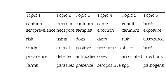 Los atributos que se destacaron en los tópicos identificados se encuentran en la Tabla 2. Solo fueron destacados seis atributos para los primeros seis tópicos relevantes. Entre ellos fueron escogidos los siguientes: “abortion,” “exposure,” “gondii,” “dogs” y “sheep,” como los más relevantes.