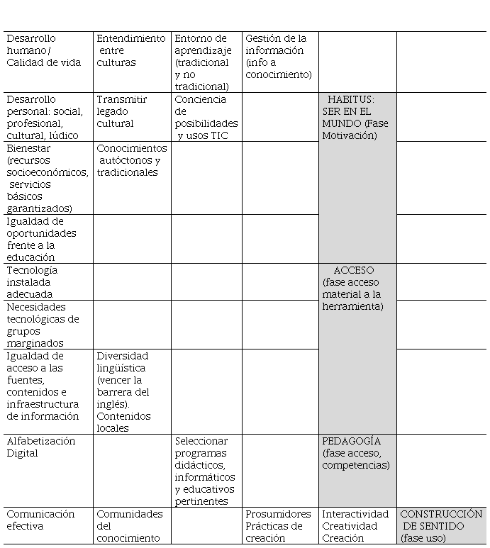 El Cuadro N°1 presenta los principales componentes de la herramienta de evaluación ValoraTIC donde se establecen y adaptan las metas que se van a lograr según las necesidades de las comunidades de impacto del proyecto miPáramo®, las cuales surgen de relacionar los elementos claves del enfoque de Sociedades del Conocimiento con las cuatro fases de acceso propuestas siguiendo el modelo de Jan A.G.M. van Dijk. Cada meta a su vez, se relaciona con una de las competencias propuestas en el Informe UNESCO, hecho por (Delors, 1996, p. 91). Esto con el fin de comprender la relación del sujeto con la tecnología siendo multisistémico y debe propender por fortalecer las capacidades humanas como un todo. Es un error pensar que la tecnología solamente se mide en función solo de acceso y conectividad.