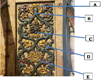 Nota: A. Flor del Espíritu Santo (Peristeria elalata- Orchidaceae), B. Columna de frutos de granada (Punica granatum-Lythraceae), C. Rama descendente de marañón (Anacardium occidentale-Anacardiaceae), D. Fruto de marañón (Anacardium occidentale- Anacardiaceae) E. Rama de hojas de bola de cañón o granadillo (Couropita guianensis- Lecythidaceae) conflor terminal, F. Flor de bola de cañón o granadillo (Couroupita guianensis) y sus hojas. Iglesia San Francisco de Asís, San Francisco de la Montaña, provincia de Veraguas.
