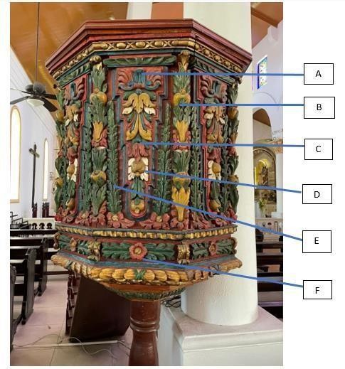 El púlpito de esta catedral es trabajado en madera de cedro amargo (Cedrela odorata- Familia Meliaceae), madera muy fácil de trabajar, de alta dureza y con una cantidad alta de polifenoles que no permiten que las termitas o comejenes la deterioren con el paso del tiempo. Estos fenoles ayudan a que la fijación de las pinturas en la misma sea más llamativa. Considerando está característica de la madera, se presenta un púlpito con elementos vegetales muy coloridos. Entre las especies vegetales presentes hacia el centro del tablero de la catedral (Figura 4) en la posición superior de este púlpito están las orquídeas (Familia Orchidaceae) por poseer un pétalo medio, grande e irregular (labelo), el mismo en muchas especies tiende a tener forma de paloma que en este caso representa al Espíritu Santo con la flor del Espíritu Santo (Peristeria elata) que es la flor nacional de Panamá. Seguidamente al centro se observan hojas