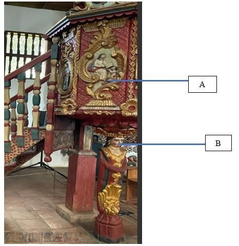 Nota: A. Representación del evangelista San Mateo en la tribuna del púlpito. B. Indiátide (rostro de una indígena), escultura que conforma el pedestal del púlpito.