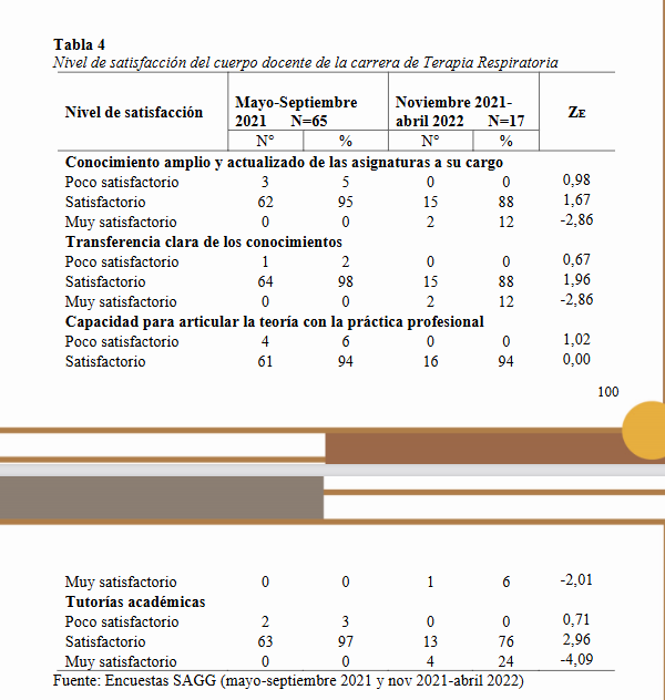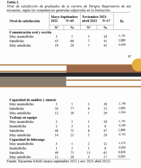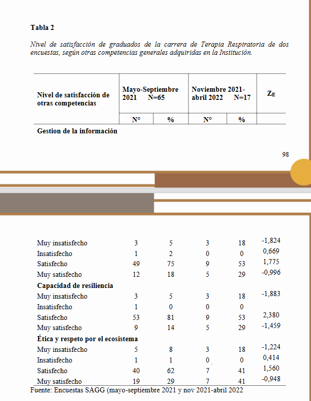 Abstract: The objective of this work is to compare the follow-up surveys to graduates of the Respiratory Therapy career of the Faculty of Health Sciences in the period May - September 2021 and November 2021 - April 2022. The methodology used is observational, cross-sectional and analytical, based on the results of the SAG00 diagnostic surveys conducted on the graduates, provided by the secretary of the career and the respondents were contacted via email and also by telephone to obtain the information. Graduated 66 students from the entering class of 2016 - graduation year 2021, and graduated 46 students, from Graduate Follow-up November 2021-April 2022 surveying 17 students. The test statistic for the difference of two proportions was calculated, the null hypothesis is stated as the H0: p1-p2=0, in a bilateral test; with a confidence level of 99% and α=1%. The results show a predominance of the satisfactory level in both surveys in relation to general competencies, extended hours of practice and subjects specific to the career; satisfaction with the teaching staff of the career prevails and the differences in items of this topic are statistically significant; the knowledge acquired was considered more frequently useful in both surveys, as well as in the quality of the services provided. The employment situation of the graduates is not good since almost none of them are working, because there are no jobs available for this profession.