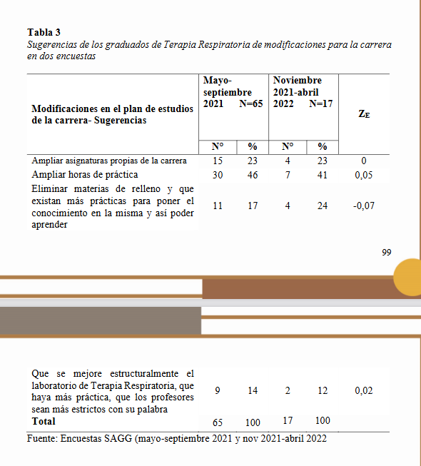 De las sugerencias que se dieron para el plan de estudio, ampliar las horas de práctica y de las asignaturas propias de la carrera son las propuestas más relevantes. El nivel de satisfacción de los docentes define diferencias significativas entre ambas encuestas en el conocimiento amplio y actualizado de las asignaturas a su cargo y en la transferencia de conocimientos, más favorable para la segunda encuesta lo que sugiere mejoría según opinión de los graduados; las tutorías académicas, también establecen diferencias con el estadístico calculado en la categoría de muy satisfactorio, favorable para los que terminaron en el 2022.