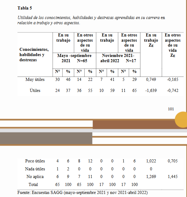 En la tabla 5 se presenta el resultado de respuesta de los graduados a considerar útiles los conocimientos y demás prácticas, aprendidas a lo largo de la carrera, esencialmente la mayoría opinó que son útiles para el trabajo, pero en la segunda pesquisa se consideró mayor la utilidad para otros aspectos de la vida, lo cual pudiera responder a las dificultades que han encontrado en la búsqueda de trabajos relacionados con su perfil ocupacional. No se encontraron diferencias estadísticas en los porcentajes calculados en ambas encuestas.