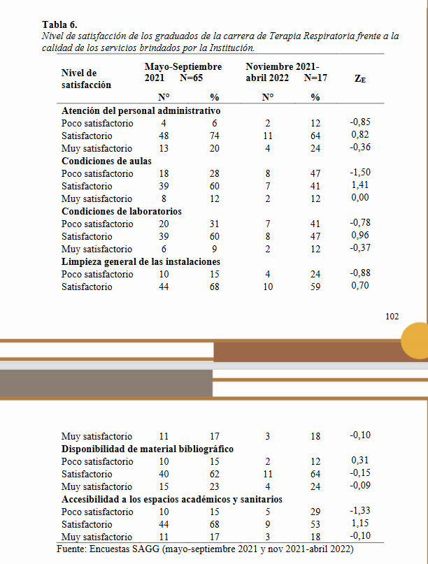 Importar_Imgen5265c64616ingreso del 2016 - año de graduación 2021, y graduó a 46 estudiantes, de Seguimiento a Graduados noviembre 2021-abril 2022 encuestando a 17 alumnos. Se calculó el estadístico de prueba para la diferencia de dos proporciones, la hipótesis nula se plantea como la H0: p1-p2=0, en una prueba bilateral; con un nivel de confianza del 99% y α=1%. Los resultados arrojan un predominio del nivel satisfactorio en ambas encuestas en relación a competencias generales, ampliar horas de práctica y asignaturas propias de la carrera; la satisfacción con el cuerpo docente de la carrera prevalece y se hace estadísticamente significativa las diferencias en ítems de este tema, los conocimientos adquiridos se consideraron en mayor frecuencia, útiles en ambas encuestas, así como también en la calidad de los servicios brindados. La situación laboral de los graduados no es buena ya que casi ninguno está trabajando, porque no hay empleo disponible para esa profesión.