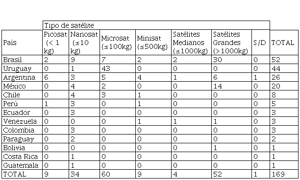 A pesar de esta institucionalidad diversa y, en general, débil, en la región se realizan actividades espaciales, aunque poco sostenidas. No son pocos los países latinoamericanos que pueden operar satélites. Sin embargo, las capacidades de diseño y construcción se concentran en Brasil, Argentina, México y más recientemente, Uruguay. Cada objeto espacial (nombre técnico de los satélites artificiales) se registra ante la Oficina de las Naciones Unidas para Asuntos del Espacio Ultraterrestre (UNOOSA). Dicho registro incluye el nombre del país al que pertenece el propietario, público o privado, de cada objeto espacial. Los países de América Latina y el Caribe registran el lanzamiento de 169 objetos espaciales desde 1985 hasta diciembre de 2023, con diferentes tamaños y, por tanto, con diferentes capacidades operativas (Tabla 1).