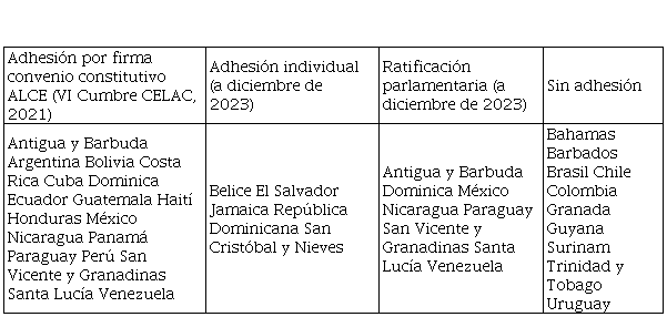 En 2022, la presidencia de CELAC fue transferida a la República Argentina y en 2023 a San Vicente y las Granadinas. Durante estos periodos, se buscó sumar nuevas adhesiones, lograr las ratificaciones parlamentarias de cada país y receptar las respectivas comunicaciones diplomáticas, para iniciar la vida jurídica de ALCE. En efecto, en esos años se concretaron nuevas adhesiones (Tabla 3).