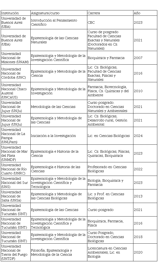 Se analizó la presencia o ausencia de contenido referido al PLACTED a partir de la cita de autores vinculados a esta corriente de pensamiento, en los programas de asignaturas o cursos vinculados a la Epistemología, Metodología e Historia de la Ciencia en carreras de grado y posgrado de Ciencias Biológicas, o carreras afines, de las distintas universidades del país. Se excluyó a la Universidad Nacional de La Plata dado que en ella se dicta el curso Ciencia, Tecnología y Sociedad que dio lugar a este trabajo. Las instituciones incluidas fueron aquellas en las que se pudo tener acceso a los programas a través de las páginas oficiales de las asignaturas. Se compilaron las referencias bibliográficas de todos los programas y se analizaron con el objetivo de identificar los autores más referenciados en ellas, y particularmente aquellos vinculados al PLACTED.