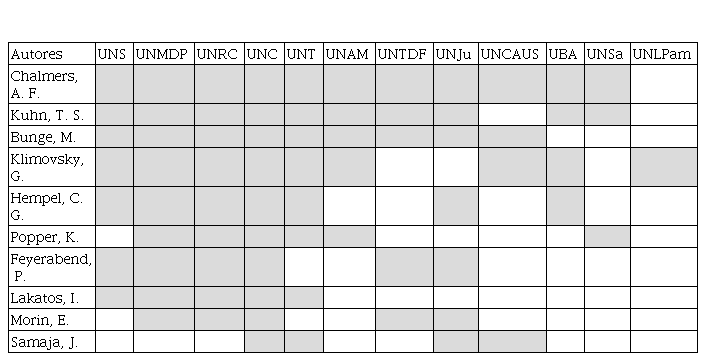 Por otro lado, los autores más compartidos entre programas fueron Chalmers, Kuhn, Bunge, Klimovsky, Hempel, Popper, Feyerabend, Lakatos, Morin y Samaja (ver Tabla 2). Analizando por institución se destaca que Chalmers fue citado en programas de once instituciones de las doce involucradas en el estudio (11/12), Kuhn en 10/12, mientras que Bunge y Klimovsky ambos en 9/12.