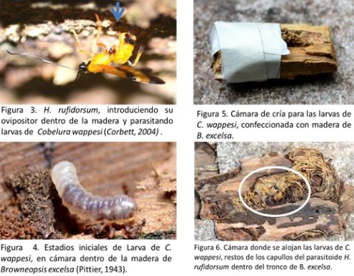 Durante el recorrido se logró observar un tronco caído de Browneopsis excelsa (Pittier) 1943 (Fabaceae: Caesalpinioideae), el cual presentaba evidencias de colonización por larvas de Cerambycidae y la presencia sobre el tronco de avispas parasitando dichas larvas. Se captaron imágenes fotográficas de seis individuos de la avispa parasitoide H. rufidorsum cuando se encontraban introduciendo su ovipositor en el tronco de B. excelsa parasitando las larvas de C. wappesi (Figura 3). Una vez en el laboratorio se captaron imágenes fotográficas de los adultos del parasitoide y sus hospederos por medio de la cámara digital, bajo el estéreo Motic-SMZ-143.