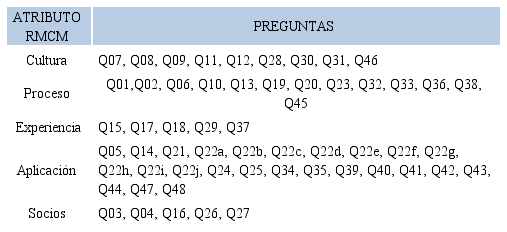 Los atributos evaluados son cultura, proceso, experiencia, aplicación y socios. La correspondencia entre la segunda parte de preguntas de la encuesta y los atributos del modelo RMCM se muestran en la Tabla 1.