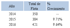 Los siguientes corresponden a los resultados de Torres (2017) que es fuente principal de este documento. De acuerdo con la información recopilada, las flotas han tenido una tendencia de crecimiento promedio de 9.7% en los últimos dos años. Esta tendencia al parecer tiene coherencia dado que la demanda de combustible claro también está en alza en estos años evaluados. La Tabla 3 resume los datos del total de crecimiento de la flota.