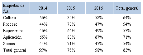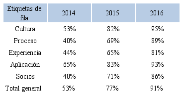 Para el 2016, el nivel de cultura y aplicación se alcanzaron niveles de excelencia; en el proceso, en experiencia y en socios se alcanzaron niveles competentes