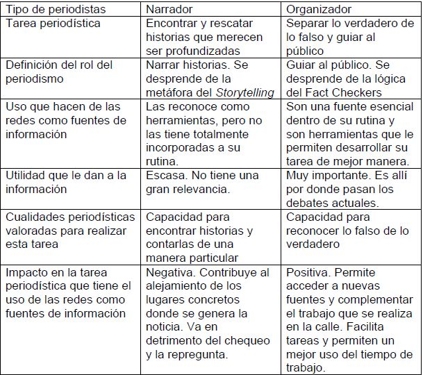 Los periodistas entrevistados coinciden en que las redes sociales hoy se han constituido en herramientas dentro de la rutina periodística. Una de sus funciones tiene que ver con la de ser fuentes de información. Ahora bien, la definición de que hacer con lo que allí circula, genera posturas distintas, que pueden ser codificadas a través de dos tipos: el Narradory el Organizador. Como se dijo más arriba, en estas maneras de plantarse frente a las redes como fuentes confluyen, su definición del rol del periodismo, el uso que hacen de las redes como fuentes de información, la utilidad que le dan a la información que aparece en las redes sociales, las cualidades periodísticas que valoran y la manera en la que estas impactan en la actividad periodística en general (Ver Cuadro I en el apartado de Tablas y Cuadros).